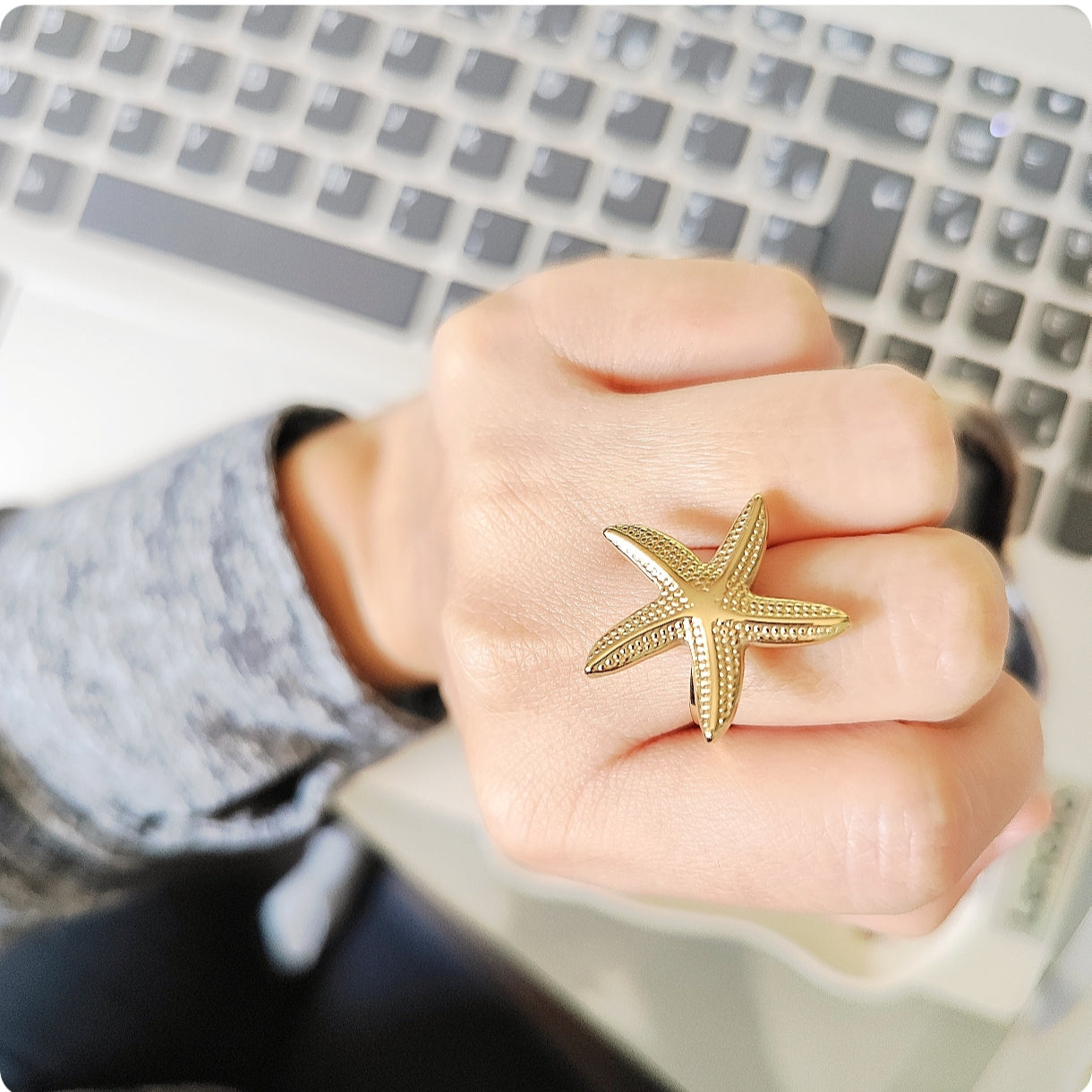 Bague en acier inoxydable doré, ornée d’un motif délicat d’étoile de mer. Elle est hypoallergénique pour un port confortable (consultez nos conseils d’entretien).